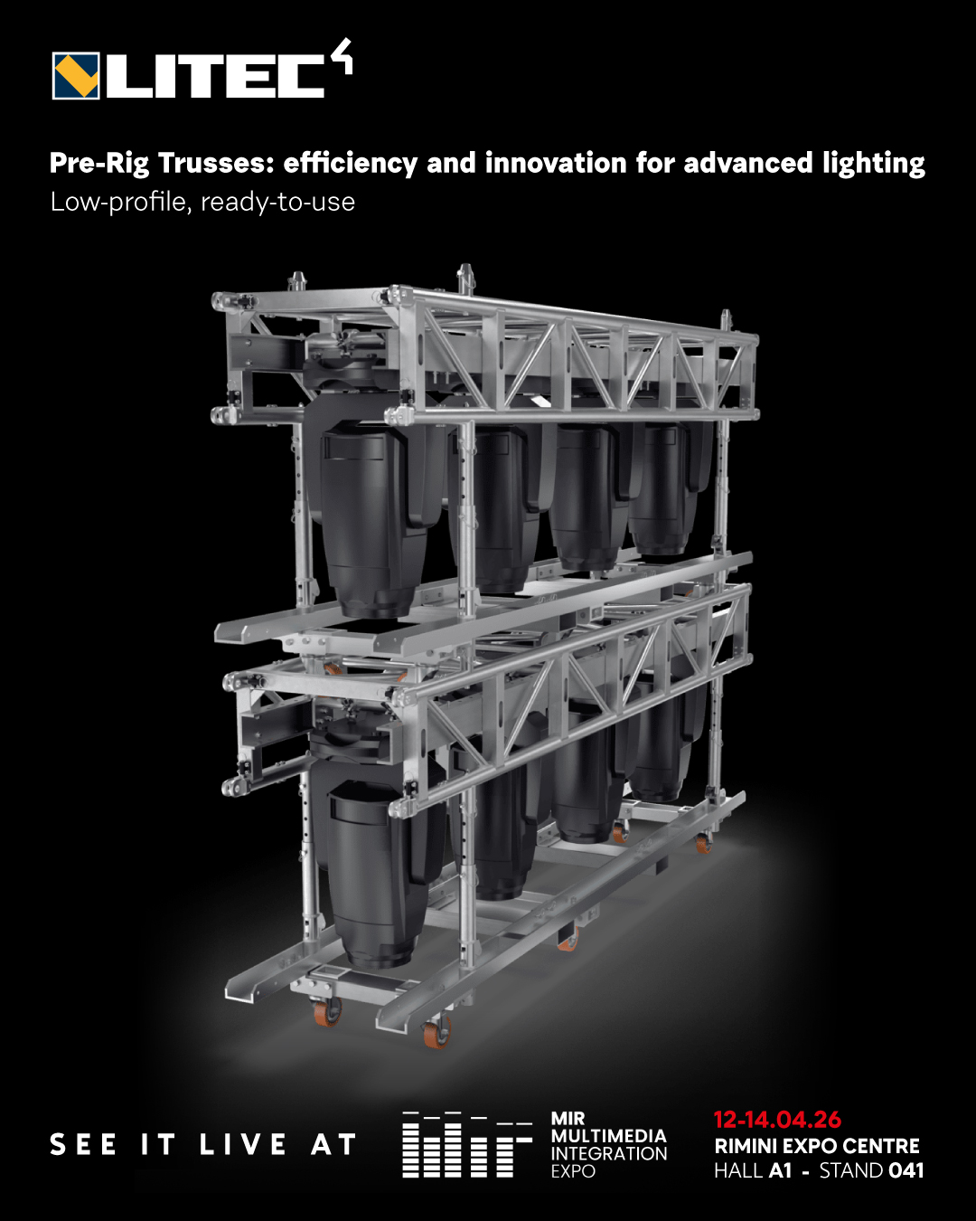 LITEC pre-rig trusses, with a height of just 60 cm, offer a range of configurations for housing lighting fixtures and intelligent luminaires, designed to meet the needs of the most demanding professionals.