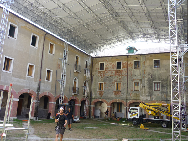 The four foot bars are telescopic, positionable, individually adjustable and extractable. This model also comes in a compact-base Maxitower 52E version suitable for indoor use. The comes complete with stabilization, motor coupling, hanging and safety accessories.