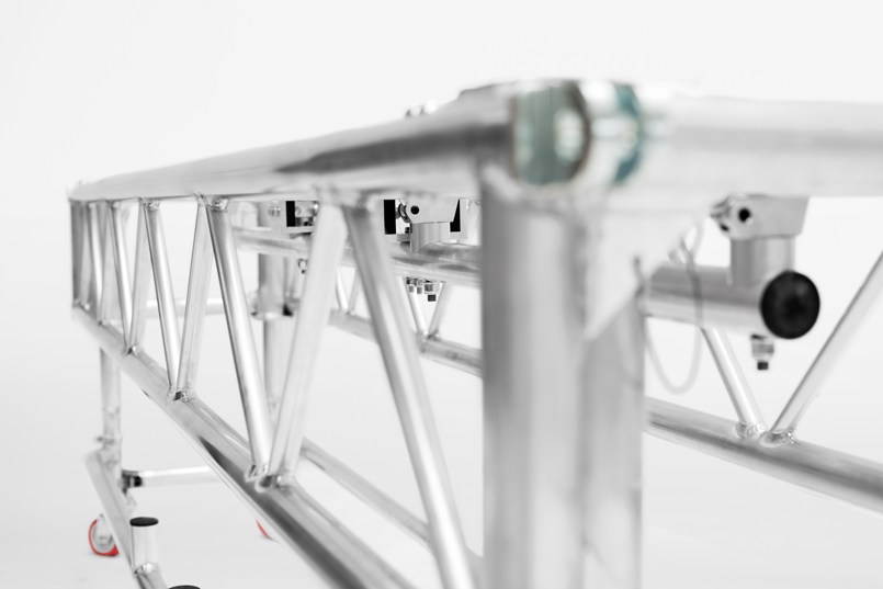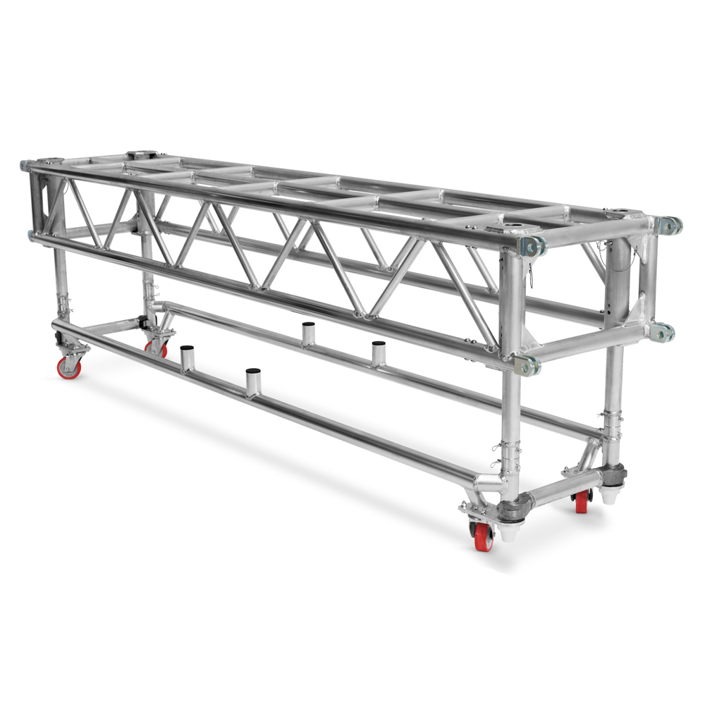 A pre-rig truss for supporting and transporting moving heads. It is equipped with 4 castor wheels for easy maneuverability and pins for the connection of truss pieces. Each truss is designed to carry a lighting bar complete with moving heads. The lighting bar is hooked onto the main chord and allows lights to move. This design reduces the amount of space required for rigging in the truck.