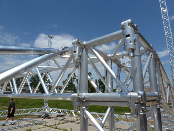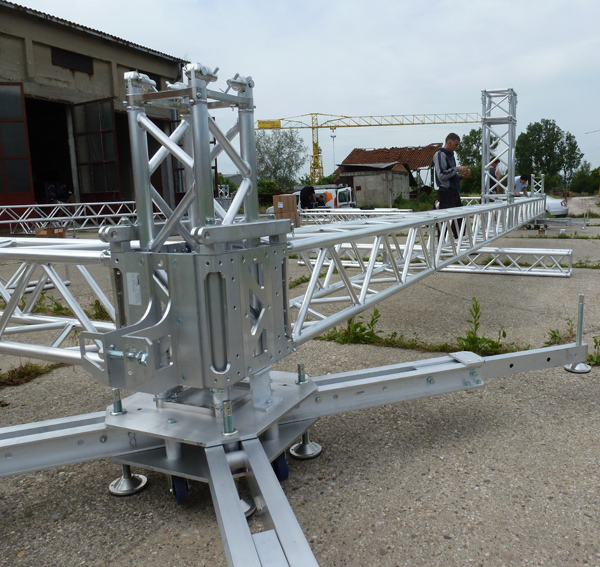 The system is furnished with telescopic stabilizers, multistandard sleeve block with 16 gliding wheels in high density rubber, and top designed for chain feed. The complete system, except the central truss, is composed of assembled parts, without any weldings. Varitower 3 can use only chain hoist systems, be they manual or electric.