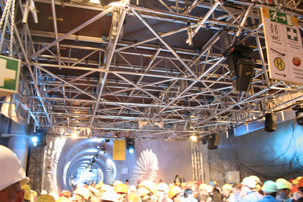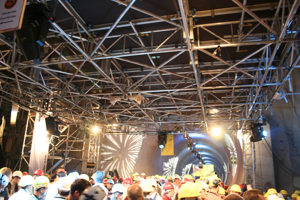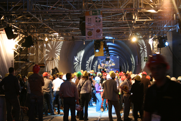 AlpTransit is a high-speed railway project that runs through Switzerland. It is an underground railway passage through the Alps splitted in base tunnels excavated hundreds of meters under the current ones. More than 1,000 guests and many transalpine televisions took part in the special event organised for the fall of the last partition of the Lötschberg Base Tunnel.
