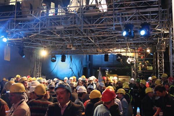 They attended the moment when the miners symbolically shook their hands with the others of the opposite side. For the video shooting a 10.5mx8m truss structure in LIBERA FL52 was set up. The system was supported by 4 Maxitowers MT40 and carried out with 6 hanging points for the creation of a technical intermediate gallery.